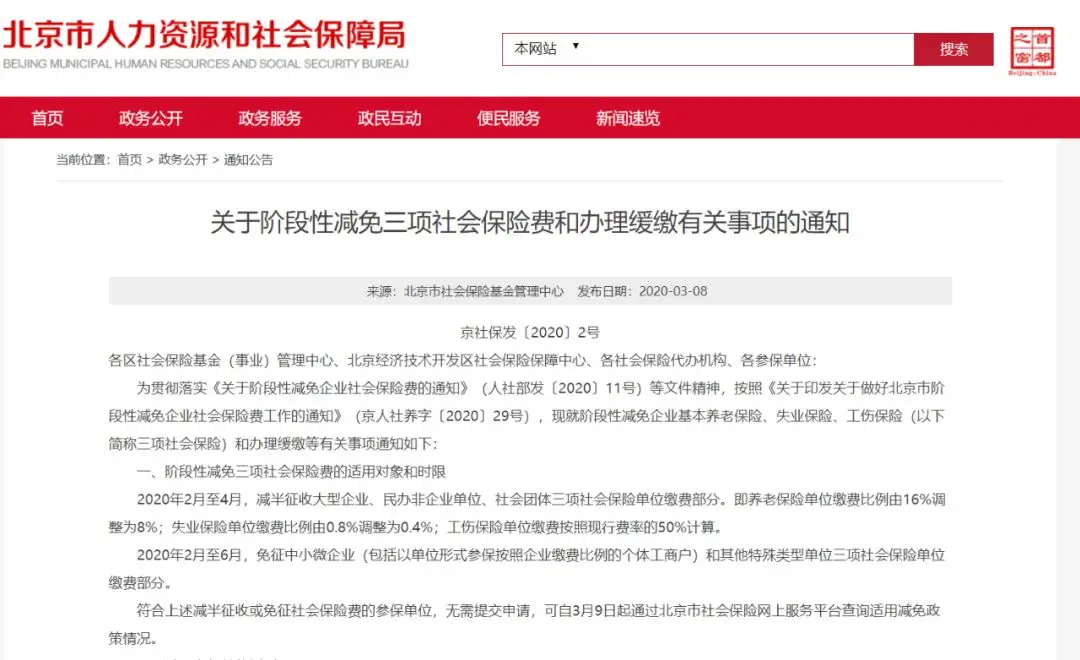 北京市人力资源社会保障局3月8日正式下发,社保减免文件,文件明确2020年2月至6月,对中小微企业(包括以单位形式参保的个体工商户)和其他特殊类型单位,三项社会保险的单位缴费部分将全部免征,个人缴费部分不免。